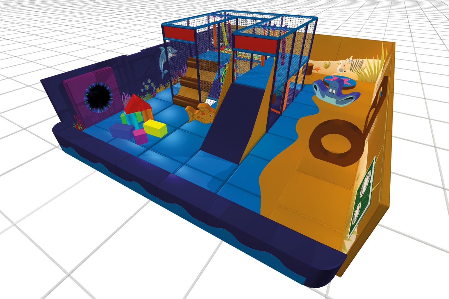 Our design team worked closely to ensure every possible area was utilised with maximum play capacity and with themed aesthetics to reflect the location. Our portable Qube sets are very popular with hire companies and smaller businesses that require a miniature version of our adventure play systems. We were able to utilise our Qube style strucutral elements and dimensions to create a fixed structure that more efficiently utilised the space on offer. After the first design, James was blown away with the proposal. Full sea artwork surrounding the room as well as a centralised frame and surrounding mats. The design was signed off and in less than 5 weeks the team was on site ready to begin the 4 day install.