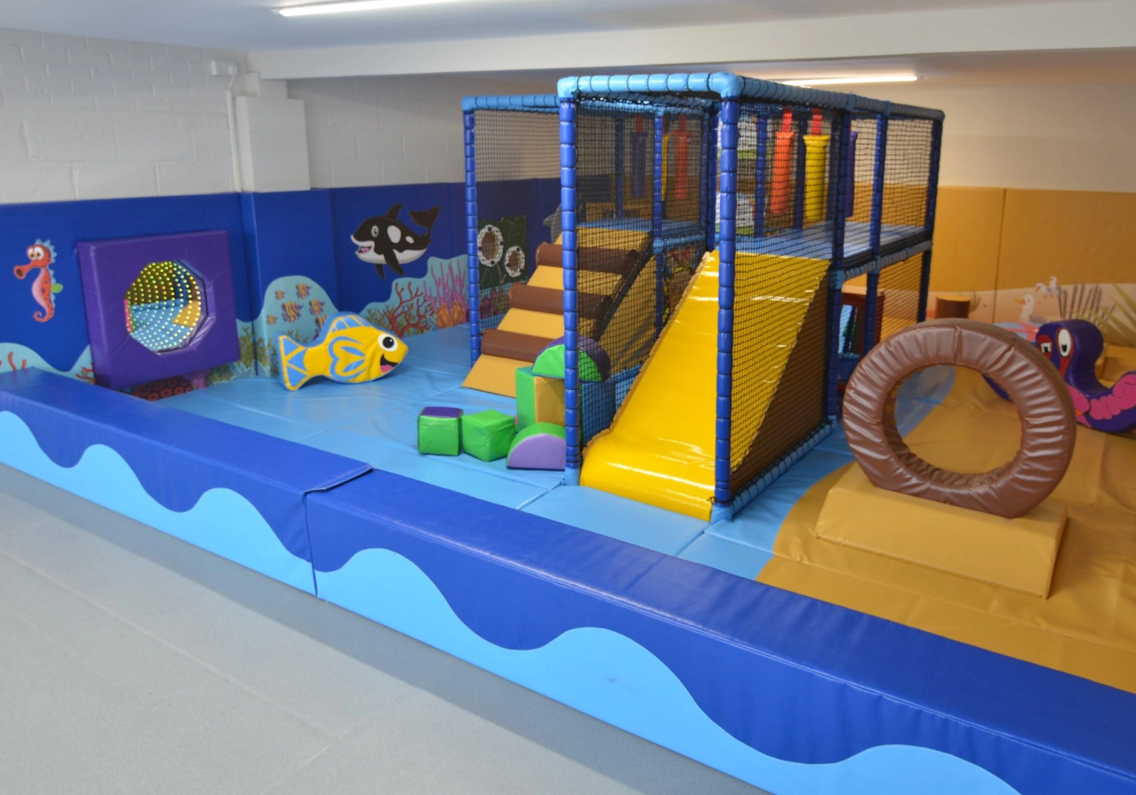 Standard frame centres measure 1.22m x 1.22m and therefore wouldn’t fit efficiently in the space, so we reduced the frame centres of each grid to70cm x 70cm which suited the room and gave a more efficient use of space. We used smaller diameter tubing and padding without compromising safety or structural integrity. Within the frame there are all the usual fun features such as a twin bay rope bridge, Spiders web, Chicane Mirrors, Hanging Snakes and hump block but all reduced in size to suit. There is also a miniature log ramp and custom-made Slide block with safety side panels that fit perfectly with the rest of the system. The area was divided using a retainer wall that an applique wave was added to, to finish the design. These were also secured to the floor to create a fixed containing wall that doubles as parental seating.