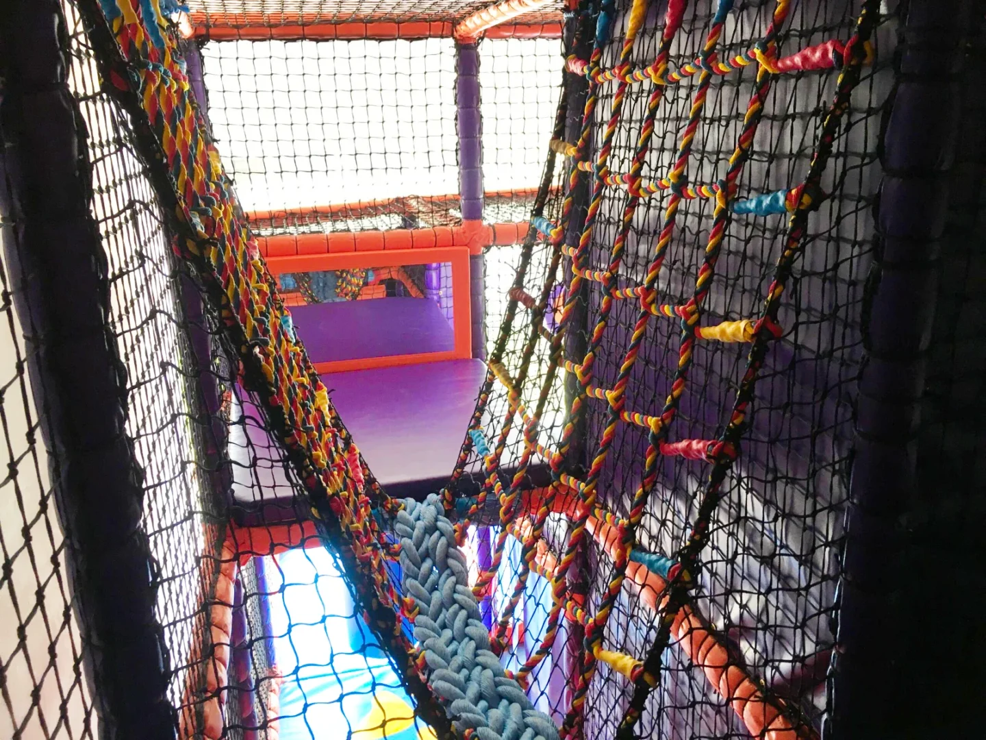 The frame laid host to a number of fun features as well as some custom-made applique finishing touches. The entrance to the system had full applique floor boards with a fun Orange and blue Sun burst. Behind this held an interactive LED Infinity mirror panel enclosed by backing vinyl’s and butchers’ curtain. The ground floor was a maze of fun climbing features like wedge floor and up & under with buffer. To the back of the system we integrated a large trampoline bed from our brief and an angled ball pool with fun target shapes suspended on the external.