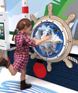 This round, wall-mounted game features a modern birch plywood frame with a clear plastic dome covering the maze, ensuring durability and a sleek look. Designed to be space-saving, it can be mounted directly to a wall or integrated into a larger play system.